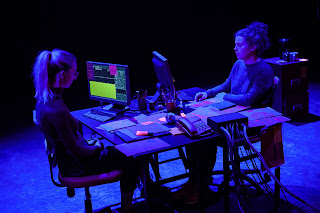 Using well-placed humour, the 50 minutes flew by. These two actresses were extremely watchable and worked nicely together, there was a real connectivity between them. However, being on the front row of a very small auditorium, and being so close to the set, there were a couple of anomolies. First of all, it was quite clear that the computers they were using - contemporary laptops - were not turned on, and the screens were black the entire time. Second, the cups of tea they had during the show were quite obviously using cold water and the kettle never boiled. The boxes they rooted through to find a particular file were both empty containing ONLY that particular file! And finally, why, since we are in the present day, was it not possible for either of them to use a mobile phone once the land-line cable had been cut? That simply didn't make any sense to me.